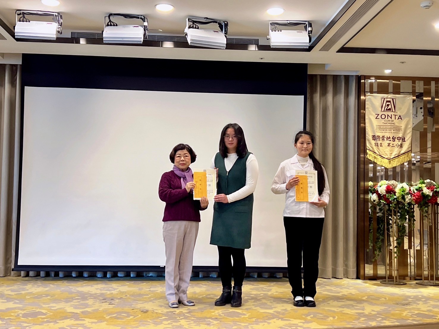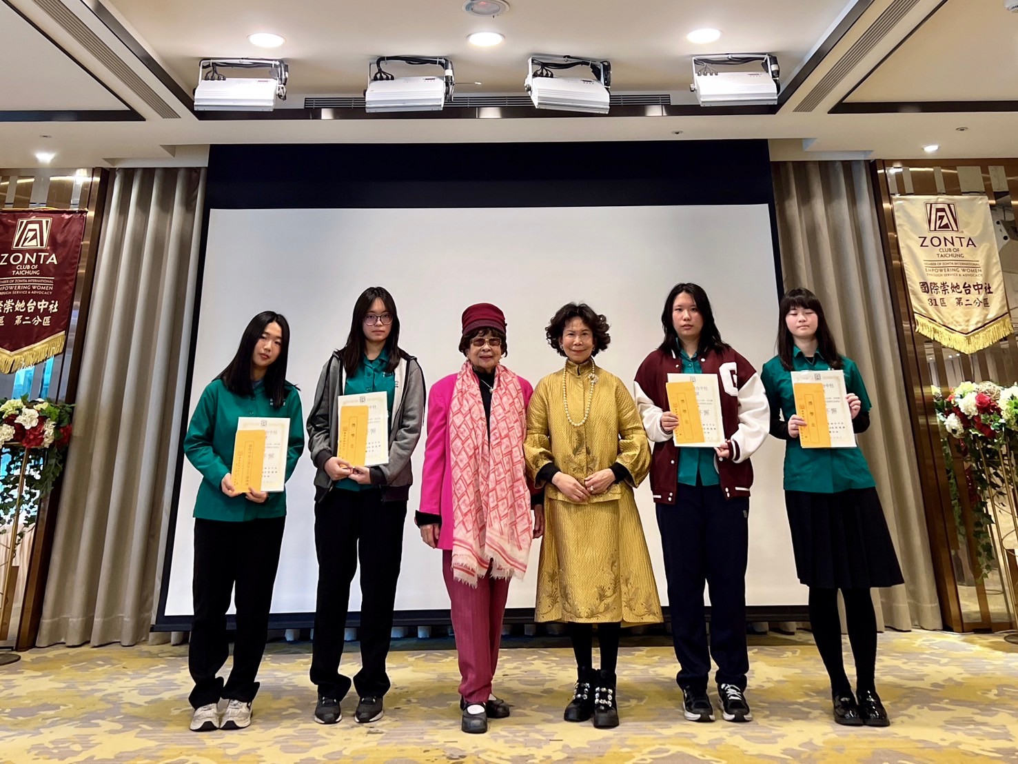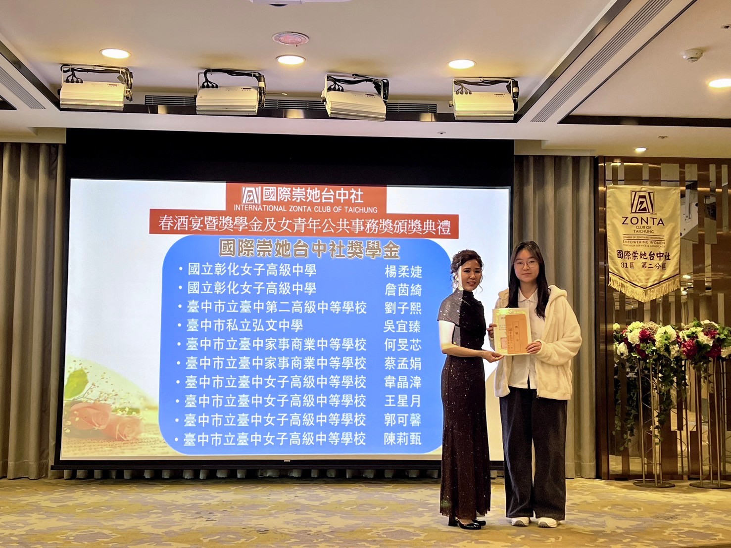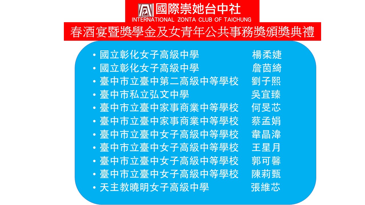 ★獎學金頒獎開始~領獎學生上台 ★頒發獎學金( 10 )~ 1:彰化女中:楊柔婕、詹茵綺 頒獎人~黃桂珠 2:台中二中:劉子熙 頒獎人~張憶緹 社長 3:弘文高中:吳宜臻 頒獎人~蘇麗鈴 4:臺中家商:何旻芯、蔡孟娟 頒獎人~林戴和惠 5:台中女中:韋晶湋、王星月、郭可馨、陳莉甄 頒獎人~盧錦玲 ★頒發YWPA獎( 1 ) 1:曉明女中: 張維芯 頒獎人~連珍伶 |