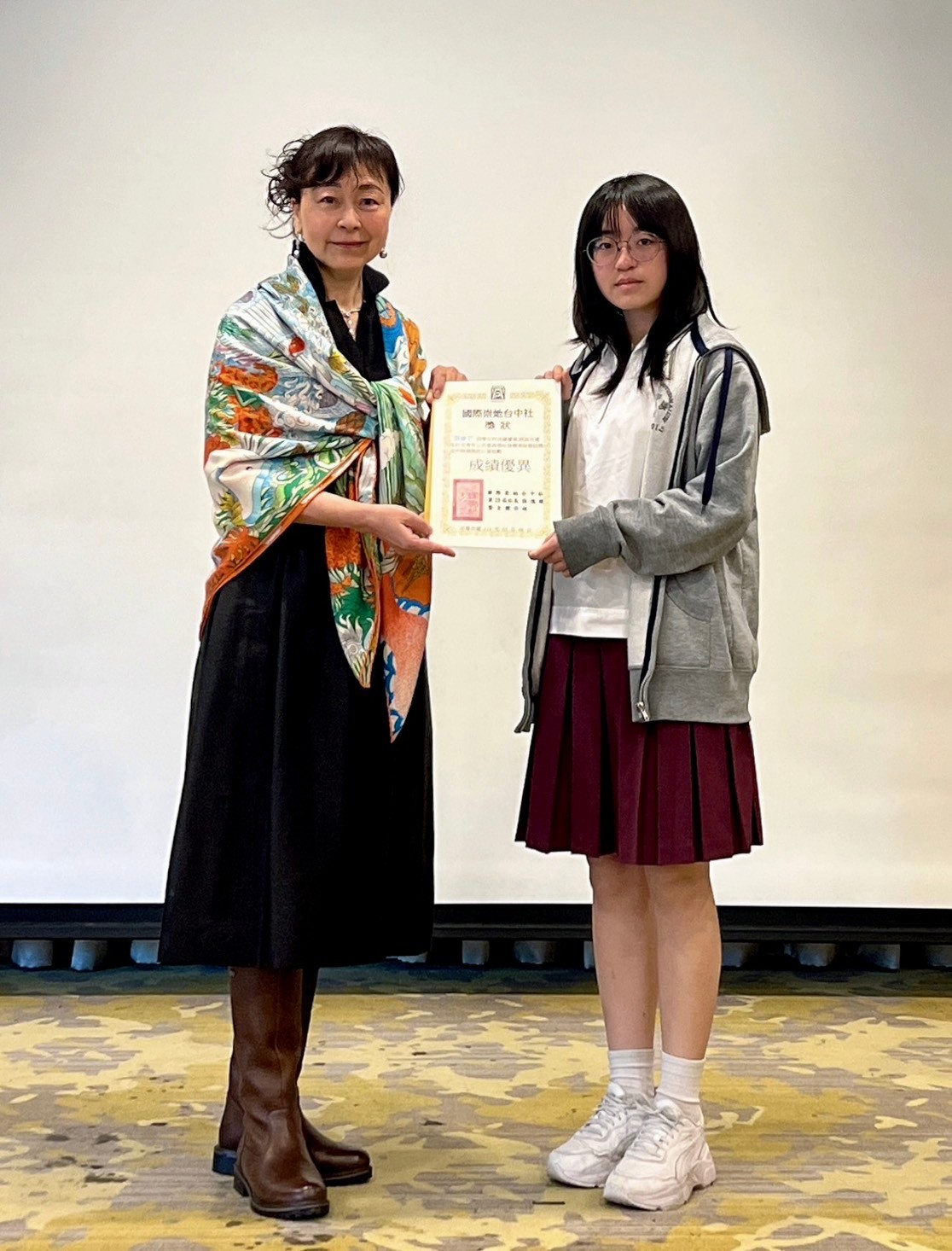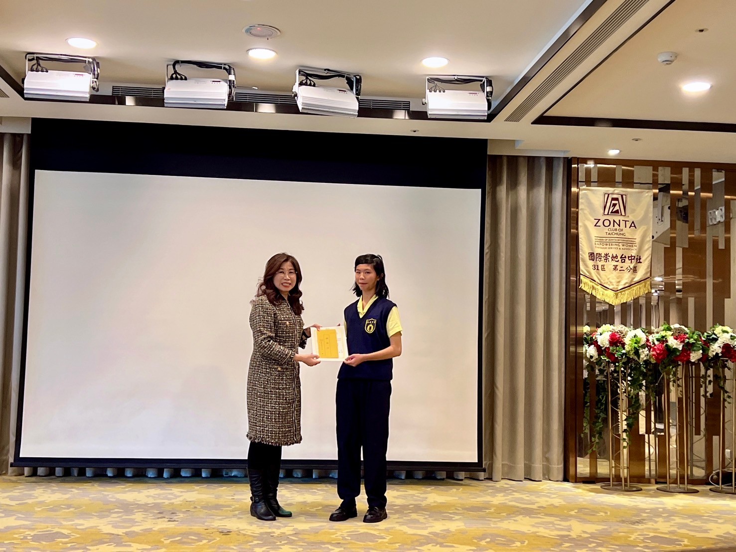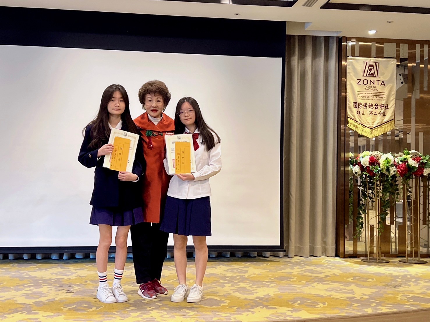 ★獎學金頒獎開始~領獎學生上台 ★頒發獎學金( 10 )~ 1:彰化女中:楊柔婕、詹茵綺 頒獎人~黃桂珠 2:台中二中:劉子熙 頒獎人~張憶緹 社長 3:弘文高中:吳宜臻 頒獎人~蘇麗鈴 4:臺中家商:何旻芯、蔡孟娟 頒獎人~林戴和惠 5:台中女中:韋晶湋、王星月、郭可馨、陳莉甄 頒獎人~盧錦玲 ★頒發YWPA獎( 1 ) 1:曉明女中: 張維芯 頒獎人~連珍伶 |